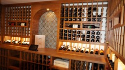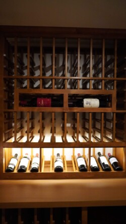 The focal point is the racking system, composed of knotty Alder wood with a lacquer and wheat stain finish. The reveal racks and horizontal display racks are also worth mentioning; they are both carefully lined with LED illumination to make reading wine labels a breeze.